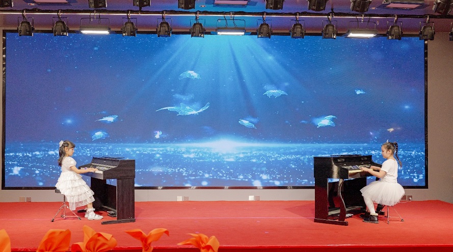 電鋼琴《初心與愛同頻》:張璟瑜(華鑫洺源公司張路之女)、鄭若溪(華鑫洺源公司鄭東昊之女)